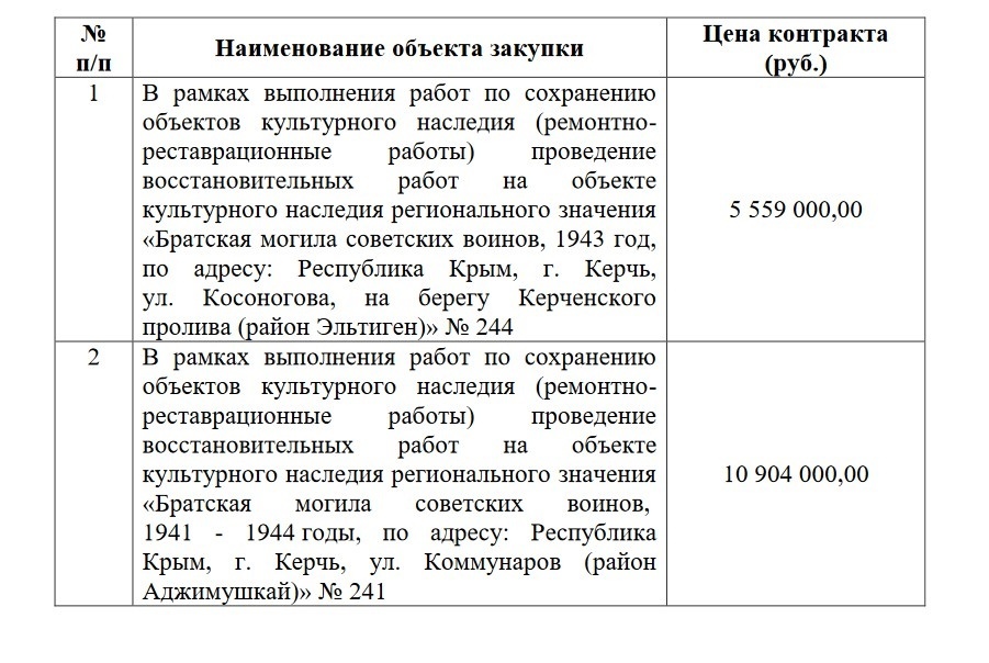 Речь идет о двух братских могилах по адресу: Керчь, ул. Косоногова, на берегу Керченского пролива (район Эльтиген) и ул. Коммунаров (район Аджимушкай).