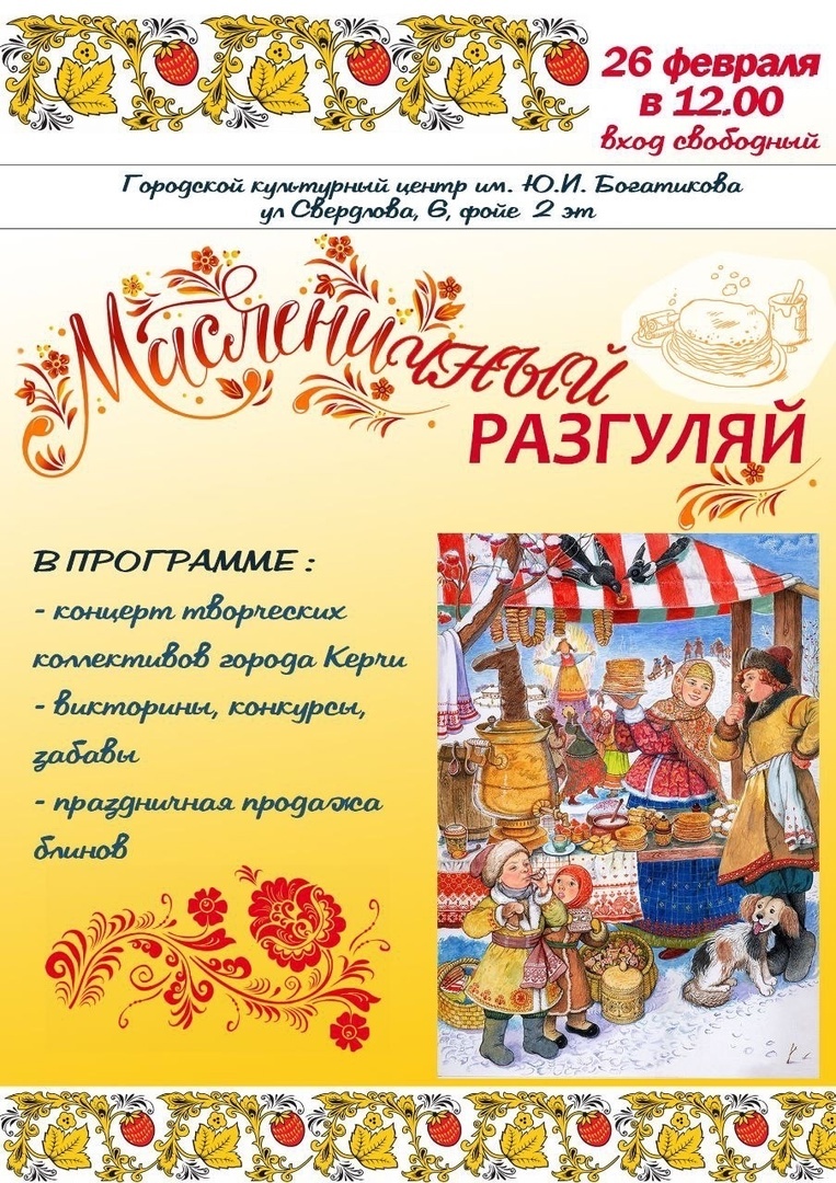 В Керчи пройдет мероприятие «Широкая масленица» в Городском культурном центре им. Ю.И.Богатикова в воскресенье 26 февраля. Об этом сообщают Новости культуры Керчи, - передает Керчь.ФМ.