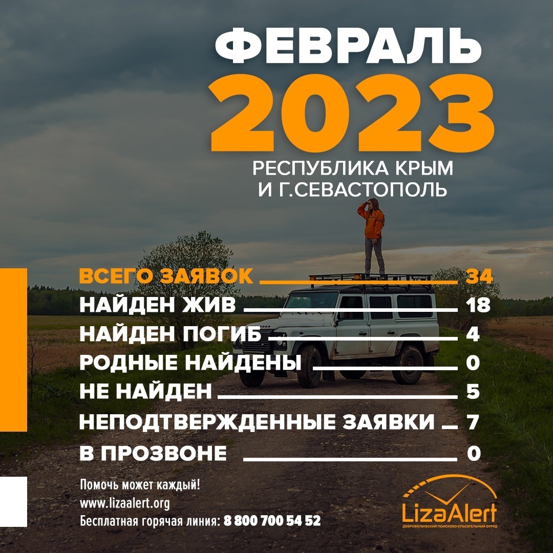 Поисковой отряд «Лиза Аллерт» в феврале принял 34 заявки на розыск крымчан. 4 человека из разыскиваемых найдены погибшими., - передает Керчь.ФМ.