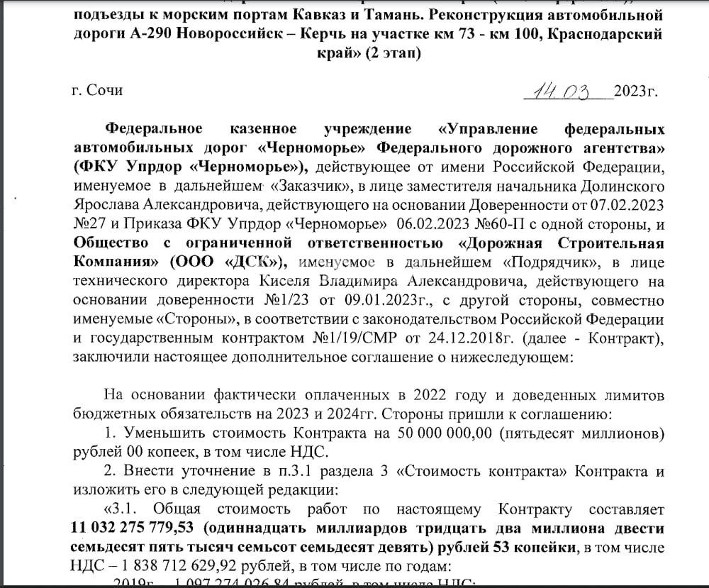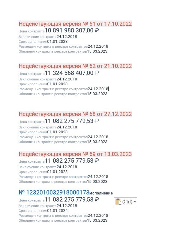 В начале контракта ожидалось, что этот участок завершат к 1 апреля 23 года, но что-то пошло не так. На протяжении последних полгода цена контракта менялась несколько раз. В начале октября 22 - 10 891 988 307, в конце октября подняли на 432, 5 млн до 11 324 568 407, перед новым годом цену изменили до 11 082 275 779, 53, т.е - 242 292 627, 47 млн (учитывая сумму в 11 млрд рублей немного смущают эти 53 копейки в конце цены контракта). Вчера цену контракта опустили на 50 млн до 11 032 275 779, 53 рубля (и опять-же 53 копейки ).