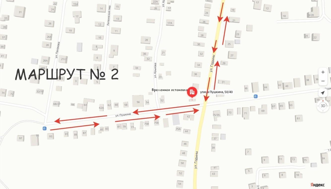 в направлении ул. Пушкина: по утвержденной схеме движения до ул. Пирогова далее ул. Комарова - ул. Годыны- временная остановка в районе дома 50/40 по ул. Пушкина далее конечная остановка "ул.Пушкина".