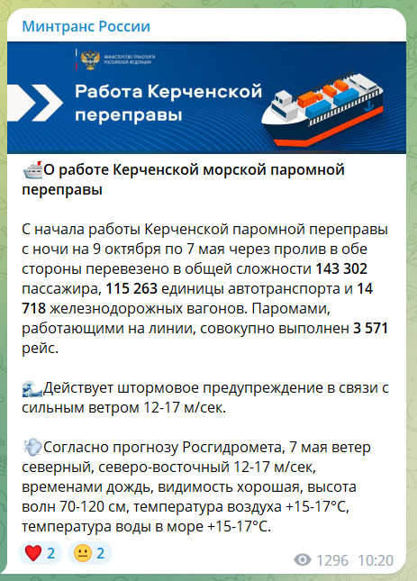 Согласно прогнозу Росгидромета, 7 мая ветер северный, северо-восточный 12-17 м/сек, временами дождь, видимость хорошая, высота волн 70-120 см, температура воздуха +15-17°С, температура воды в море +15-17°С.», - сообщает ведомство.