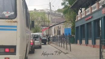 На Адмиралтейском проезде в Керчи машины встали в пробке. Все дело в том, что перед поворотом на Театральную устанавливают ситилайт, -передает Керчь. ФМ.