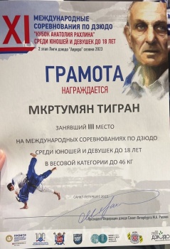 В наилегчайшем весе - 46 кг бронзовым медалистом соревнований стал керченский дзюдоист воспитанник тренеров Стрибного Владимира и Стрибного Ильи с детско-юношеского клуба физической подготовки г.Керчь Тигран Мкртумян. До поединка за выход в финал наш спортсмен одержал три досрочных победы у представителей г.Ульяновска, Санкт-Петербурга и Карачаево-Черкесии за выход в финал уступил московскому спортсмену представляющего клуб«Самбо-70» и в поединке за третье место, также одержал досрочную победу над спортсменом из Екатеринбурга. Стоит отметить, что для нашего воспитанника - это первые соревнования такого уровня, в которых он принял участие и доказал своей борьбой, что можно успешно выступать, как на уровне российских соревнований, так и на международной арене.