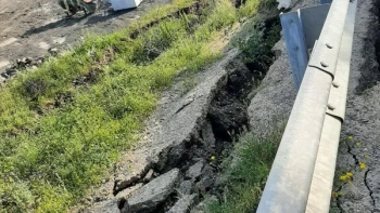Уточняется, что из-за оползня произошло обрушение части насыпи дороги, что стало причиной повреждения асфальтового покрытия и ограничения движения автотранспорта на участке трассы в районе села Лучистое.