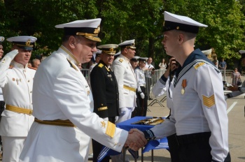 Ритуал производства в офицеры и мичманы завершился прощанием выпускников с Боевым знаменем ЧВВМУ и торжественным прохождением курсантских рот и офицеров училища.