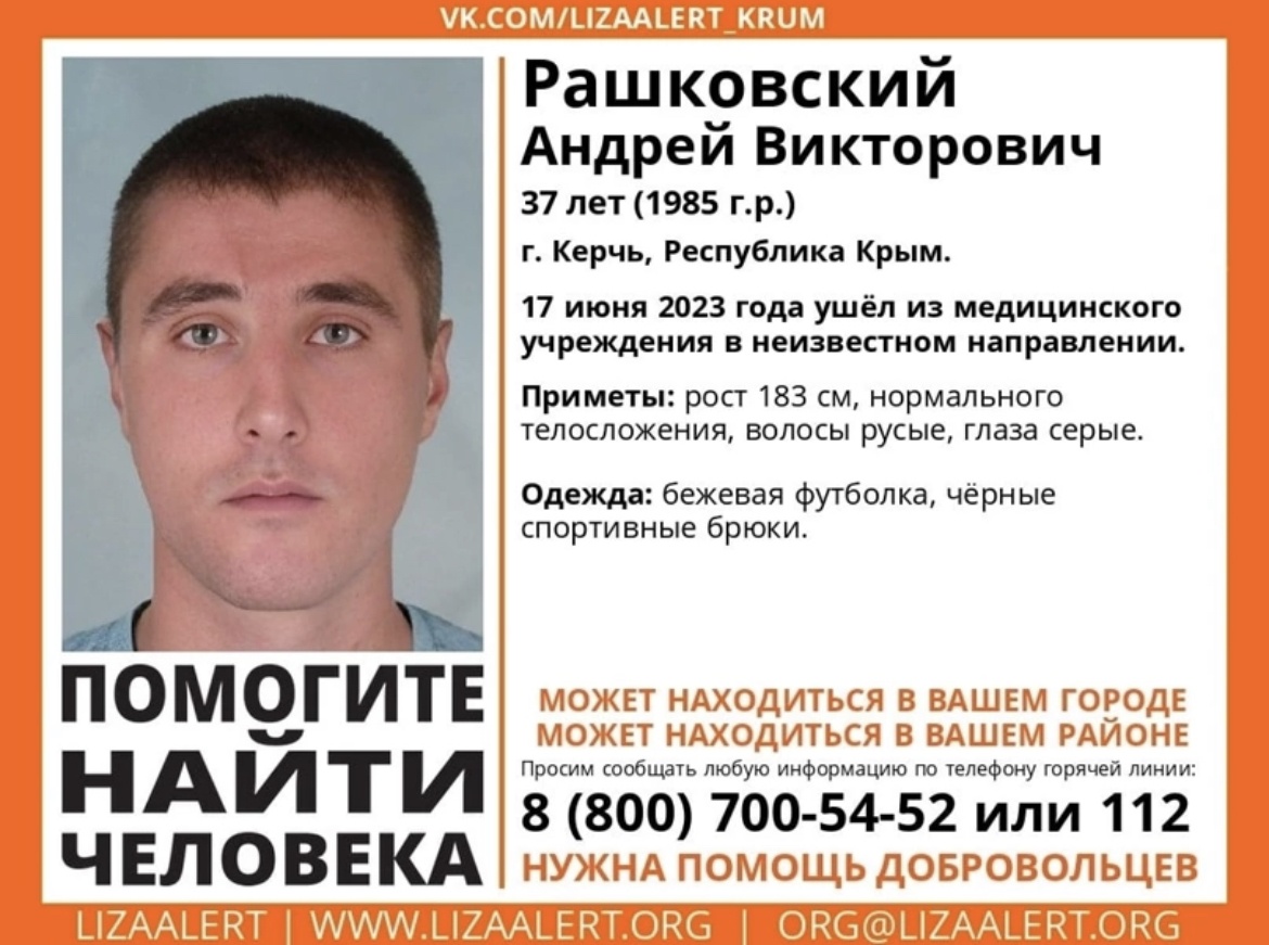 В Керчи пропал молодой человек Рашковский Андрей Викторович, 37 лет (1985 г. р.). Как сообщает поисковый отряд Лиза Алерт, 17 июня 2023 года ушёл из медицинского учреждения в неизвестном направлении, - передает Керчь.ФМ.