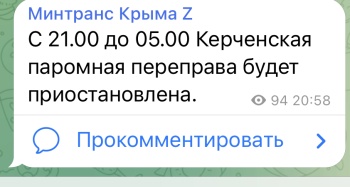 Минтранс Крыма сообщил в 20:58 о приостановке работы паромной переправы. Паромы не будут выходить из порта с 21:00 до 5 утра завтрашнего дня, - передает Керчь.ФМ.