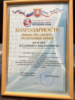 Тренеру-преподавателю Владимиру КРАСОВУ вручили благодарность Министра спорта Республики Крым за вклад в развитие физической культуры и спорта Крыма, вклад в дело воспитания подрастающего поколения, высокий профессионализм