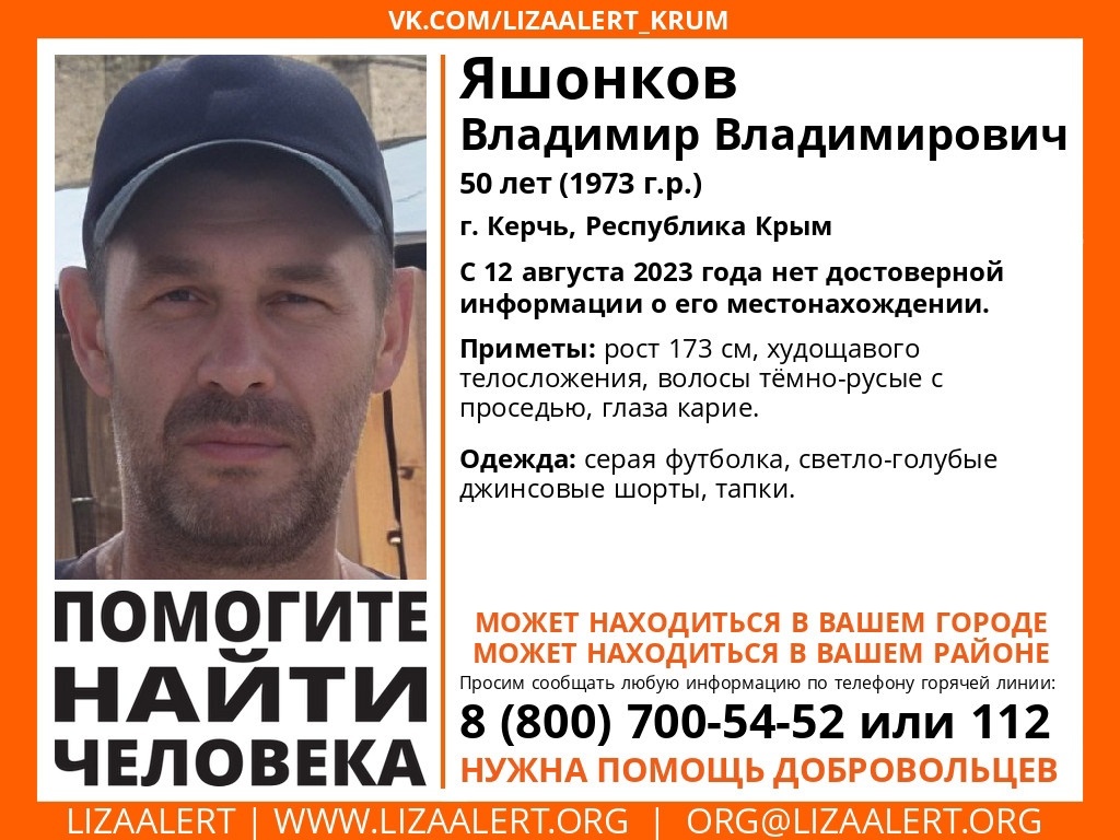 В Керчи три дня назад без вести пропал 50-летний Владимир Яшонков. Об этом сообщили в поисковом отряде «ЛизаАлерт» Крым, - передает Керчь.ФМ.
