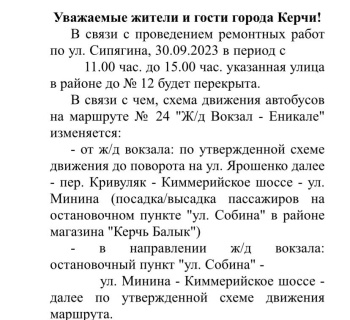 Также Ерастова сообщила о том, что сегодня перекроют дорогу к Еникале. Из-за ремонта дороги в районе 12 дома по улице Сипягина изменится и маршрут 24 автобуса.