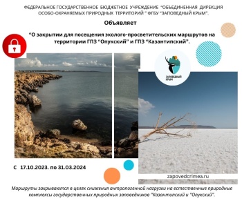 Эколого-просветительские маршруты в заповедниках «Опукский» и «Казантипский» закрываются с 17 октября 2023 по 31 марта 2024, - передает  Керчь.ФМ.
