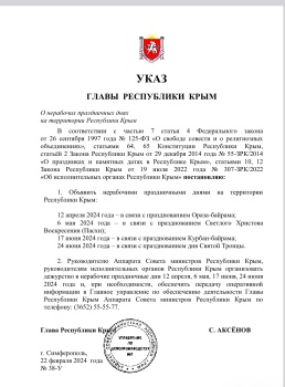 В 2024 году в Крыму устанавливаются дополнительные нерабочие праздничные дни: 12 апреля в связи с празднованием Ораза-байрама, 6 мая в связи с празднованием Светлого Христова Воскресения (Пасхи), 17 июня в связи с празднованием Курбан-байрама, 24 июня в связи с празднованием дня Святой Троицы. Соответствующий указ опубликован на портале Правительства Республики Крым.ю, - передает Керчь.ФМ.