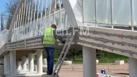 Рабочие восстанавливают конструкцию моста, прокладывают новую подсветку, изолируют ее.
