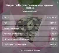 29.77 % - купят куличи в магазине. 3.82 % - закажут у кондитера, а 3.05 % вообще не будете отмечать данный праздник.