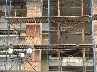 Только выступать на сцене в том виде, которую показали, как сделанную, нельзя будет никогда, так как она подвешена на пустоте, замурованной гипсой. Да и стены не выдержали бы долго, так как отделочная плитка так же во многих местах держится на пустоте. Ни в коем случае нельзя заходить за забор или стоять близко к зданию.