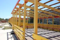 Внутри здания также продолжаются отделочные работы: покраска стен, укладка плитки в ванных комнатах, установка датчиков и т.д.