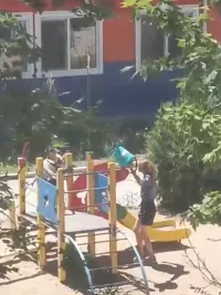 Поводом поступило видео в соцсетях, где на детской площадке детского сада шумно, а сквозь листву видно женщину, которая машет пустым ведром и слышны крики. Дети при этом не плачут, истерик нет, побоев тоже.
