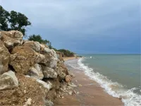 Надолго ли укрепит это сооружение песчаный берег от дальнейшего разрушения, увидим позже, но волны при прижимной волне доходят до обрыва, вымывая песок дальше.