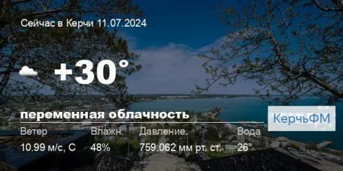 Сегодня днем в Керчи, 11 июля, ожидается переменная облачность, температура воздуха от +26.6° до +30.2°С, ветер северный 12.11 м/с, порывы до 10.06 м/с, давление 757.6 мм рт. ст., влажность 45%.