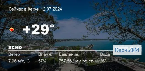 Сегодня днем в Керчи, 12 июля, ожидается ясная погода, температура воздуха от +26.4° до +30.4°С, ветер северный 12.68 м/с, порывы до 9.62 м/с, давление 756.8 мм рт. ст., влажность 52%.