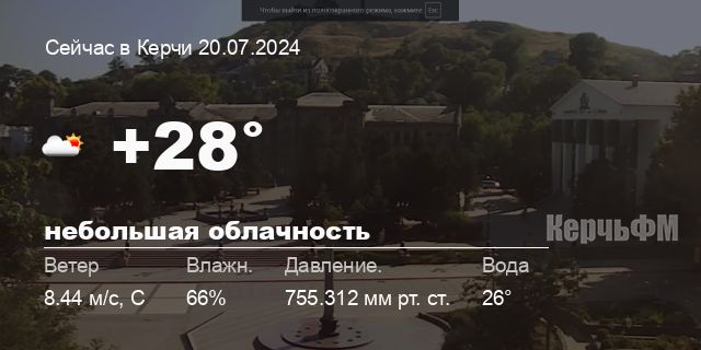 Сегодня днем в Керчи, 20 июля, ожидается переменная облачность, температура воздуха от +26.6° до +29.3°С, ветер северный 5.54 м/с, порывы до 6.86 м/с, давление 755.3 мм рт. ст., влажность 59%.
