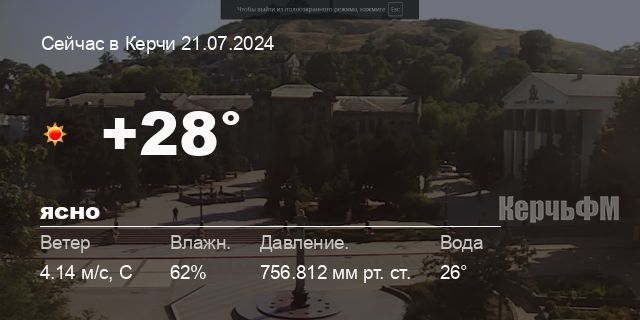 Сегодня днем в Керчи, 21 июля, ожидается ясная погода, температура воздуха от +26.1° до +28.4°С, ветер северный 2.75 м/с, порывы до 4.87 м/с, давление 756.1 мм рт. ст., влажность 57%.