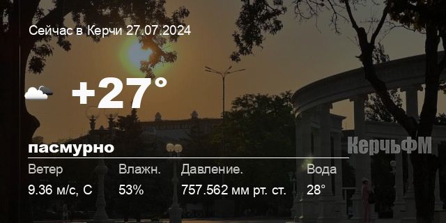 Сегодня днем в Керчи, 27 июля, ожидается пасмурная погода, температура воздуха от +26.1° до +28.9°С, ветер северный 10.2 м/с, давление 758.3 мм рт. ст., влажность 49%.