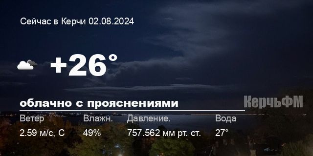 Сегодня днем в Керчи, 02 августа, ожидается малооблачная погода, температура воздуха от +23° до +28.2°С, ветер северный 4.47 м/с, порывы до 7.16 м/с, давление 756.8 мм рт. ст., влажность 42%.