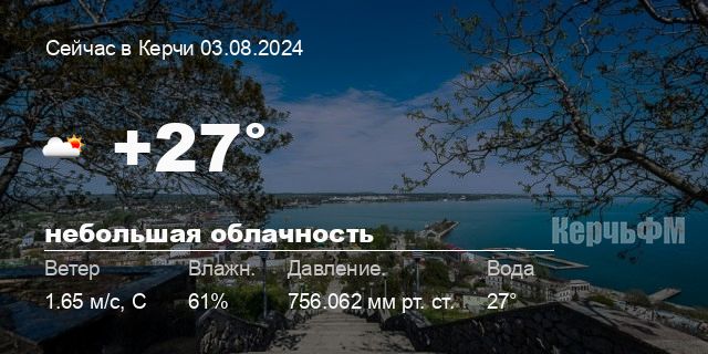 Сегодня днем в Керчи, 03 августа, ожидается ясная погода, температура воздуха от +23.9° до +28.2°С, ветер северный 2.83 м/с, порывы до 6.12 м/с, давление 755.3 мм рт. ст., влажность 56%.