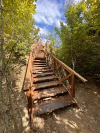Благоустроенный маршрут оборудован ступеньками, мостиками, урнами, скамейками, указателями, предупреждающими знаками и другим.