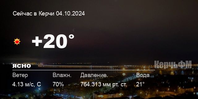 Сегодня днем в Керчи, 04 октября, ожидается ясная погода, температура воздуха от +19.1° до +21°С, ветер северный 3.17 м/с, порывы до 4.13 м/с, давление 763.6 мм рт. ст., влажность 62%.
