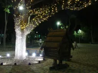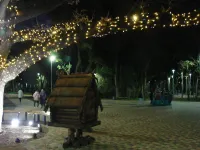 На центральной площадке со сказочными персонажами поэмы Пушкина "Руслан и Людмила" ствол и ветви раскидистого дуба украсили яркими мерцающими огнями гирлянды.