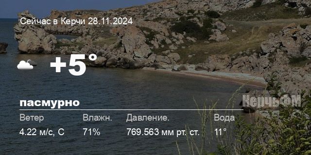 Сегодня днем в Керчи, 28 ноября, ожидается пасмурная погода, температура воздуха от +4.1° до +5.9°С, ветер северный 3.54 м/с, порывы до 6.43 м/с, давление 770.3 мм рт. ст., влажность 61%.