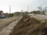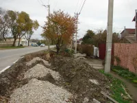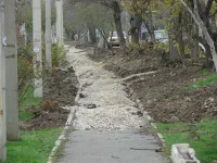 Будущий тротуар уже местами обозначен бордюрным камнем и уложен гравием. Асфальтировка начата от храма Дмитрия Донского.