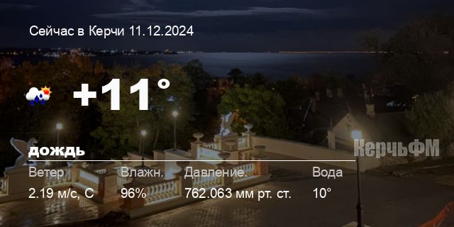Сегодня днем в Керчи, 11 декабря, ожидается пасмурная погода, температура воздуха от +7.5° до +11.6°С, ветер северный 8.29 м/с, порывы до 9.69 м/с, давление 761.3 мм рт. ст., влажность 90%.