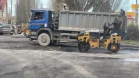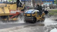 На участке трудятся рабочие и с помощью спецтехники «закатывают» дорогу в новый асфальт. Ям здесь больше не будет