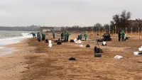 Собирают мазут с помощью лопат и грабель сразу в мешки, которые с пляжа вывозят.