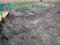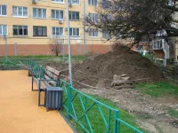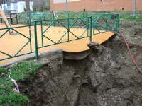 Расположено глубокое разрытие вплотную к новой детской площадке и очень беспокоит местных жителей.