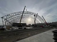 Так как сборка шатра ледовой арены завершена, теперь строители могут приступить к устройству кровли и обшивке сендвич-панелями. А там и до заливки льда недалеко.