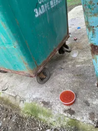 На территории, которая находится в глубине двора, есть детская площадка. Неподалеку находится площадка для мусорных контейнеров. Она пустая. Сами мусорные контейнеры стоят рядом.