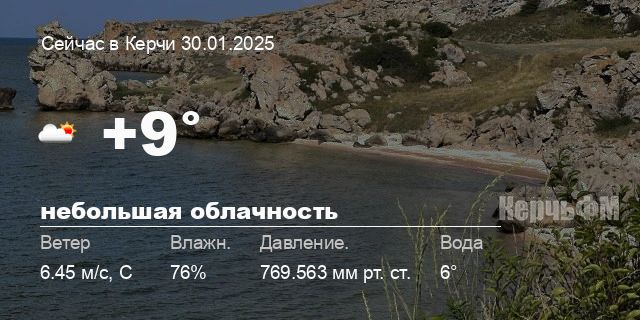 Сегодня днем в Керчи, 30 января, ожидается ясная погода, температура воздуха от +8° до +10.4°С, ветер северный 5.21 м/с, порывы до 6.45 м/с, давление 768.8 мм рт. ст., влажность 71%.