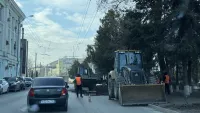 В связи с этим перекрыли частично одну полосу дороги в сторону улицы Свердлова. Работы идут на данный момент около здания администрации города.