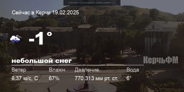 Сегодня днем в Керчи, 19 февраля, ожидается снегопад, температура воздуха от -1.4° до -0.6°С, ветер северный 8 м/с, порывы до 9.07 м/с, давление 771.1 мм рт. ст., влажность 67%.