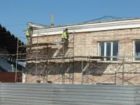 С левой части фасада уже снята до камня облицовочная штукатурка.