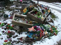 Ограждение городского кладбища за зиму и вовсе пришло в негодность. Еще осенью оно выглядело лучше. Сегодня - это сплошные дыры и поваленные плиты.