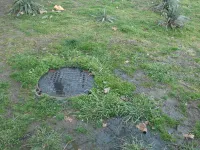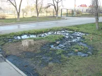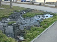 КерчьФМ побывал у дома № 13 по улице Ворошилова и убедился: стоит на газоне зловонная лужа. Неподалеку - канализационный колодец.