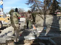Сегодня рабочие были на объекте с самого утра и к обеду успели установить бордюры на спуске и оградить ими проход по ступеням.