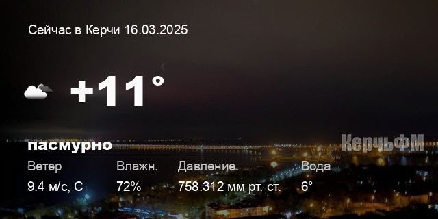Сегодня днем в Керчи, 16 марта, ожидается пасмурная погода, температура воздуха от +9.5° до +12.3°С, ветер северный 9.46 м/с, порывы до 9.49 м/с, давление 756.1 мм рт. ст., влажность 72%.
