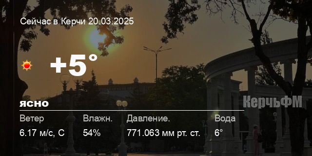 Сегодня днем в Керчи, 20 марта, ожидается ясная погода, температура воздуха от +3.6° до +5.2°С, ветер северный 6.4 м/с, порывы до 6.58 м/с, давление 771.1 мм рт. ст., влажность 55%.